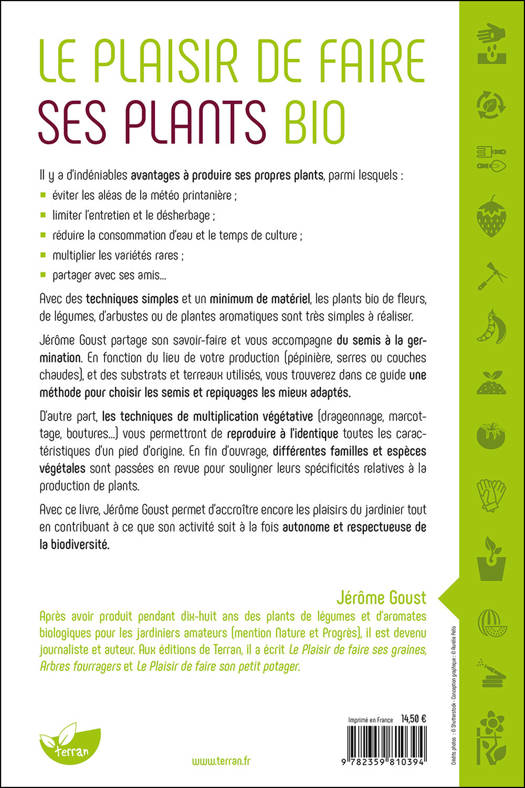 Faire ses plants de légumes, de fleurs, d'arbustes… un plaisir supplémentaire pour les jardiniers. Avec des techniques simples, un minimum de matériel, produire ses plants présente de multiples avantages : éviter les aléas de la météo printanière, entretien et désherbage limités, multiplication de variétés rares… plaisir de partager avec ses amis. Après ''Le plaisir de faire ses graines'', Jérôme Goust nous permet ainsi de compléter les plaisirs du jardinage tout en contribuant à un jardinage respectueux de la biodiversité.