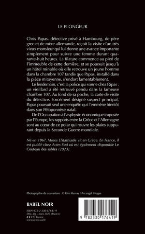 Chris Papas, détective privé à Hambourg, de père grec et de mère allemande, reçoit la visite d'un très vieux monsieur qui lui donne une avance importante simplement pour suivre une femme durant quarante-huit heures. La filature commence au pied de l'immeuble de cette dernière, et se poursuit jusqu'à un hôtel minable où elle retrouve un jeune homme dans la chambre 107 tandis que Papas, installé dans la pièce mitoyenne, s'endort lamentablement. Le lendemain, c'est la police qui sonne chez Papas : un vieillard a été retrouvé pendu dans la fameuse chambre 107. Au fond de sa poche, la carte de visite du détective. Forcément désigné suspect principal, Papas poursuit seul une enquête qui l'emmène bientôt dans son Péloponnèse natal. De l'Occupation à l'asphyxie économique imposée par l'Europe, les rapports entre la Grèce et l'Allemagne sont au coeur de ce polar qui rouvre les plaies suppurant depuis la Seconde Guerre mondiale.