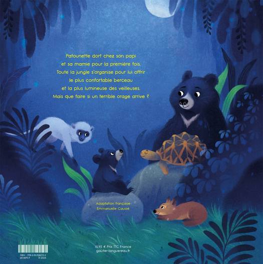 Dans la jungle, c'est le grand soir pour Patounette, la tigresse. Elle dort chez son papy et sa mamie pour la première fois. Ils ont tout préparé : un nid douillet et même des lucioles pour la veiller. Mais quand la tempête arrive, ce sont tous les animaux qui se mobilisent pour offrir le plus doux des dodos.
