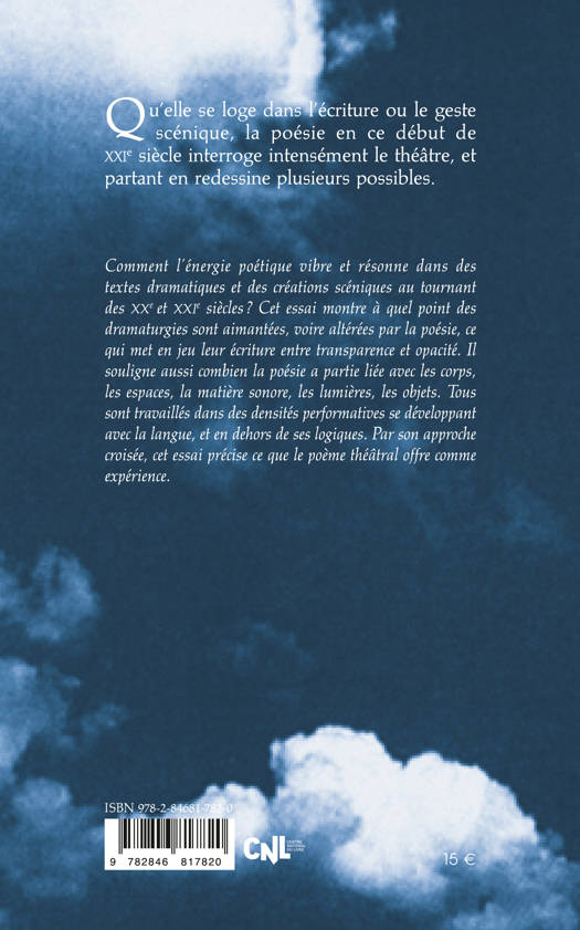 Comment saisir l’expérience poétique offerte par le théâtre au tournant des xxe et xxie siècles ? Dans cet essai, Cyrielle Dodet théorise une forme-sens qu’elle nomme le « poème théâtral ». Désireuse de s’affranchir d’une approche essentialiste et figée de la poésie au théâtre ainsi que d’une lecture générique, elle envisage l’énergie poétique de plusieurs textes dramatiques et de créations scéniques selon une méthodologie intermédiale. Plusieurs traits précisent ce poème : ses qualités médiales, sa performativité, sa valorisation de l’écriture comme processus, son attention aux matérialités, sa radicalité et sa façon de considérer l’impossible comme moteur théâtral. Traverser des textes de Sarah Kane, Daniel Danis, Philippe Malone, Samuel Gallet, Jean-René Lemoine, Tiago Rodrigues et Dany Boudreault montre comment des dramaturgies aimantées par la poésie mettent en jeu leur écriture entre transparence et opacité. Analyser certaines créations scéniques de Rébecca Chaillon, François Tanguy, Phia Ménard, Alice Laloy, Claude Régy, Guy Cassiers ou encore Baro d’Evel souligne combien la poésie au théâtre a partie liée avec les corps, les espaces, la matière sonore, les lumières, les objets, tous étant travaillés dans des densités matérielles et performatives qui se développent et se métamorphosent en lien avec la langue, mais aussi en dehors de ses logiques sémantiques, voire logocentrées. Par son approche croisée de textes théâtraux et de créations scéniques du spectacle vivant, cet essai précise ce que le poème théâtral propose au lecteur et au spectateur comme expérience esthétique.