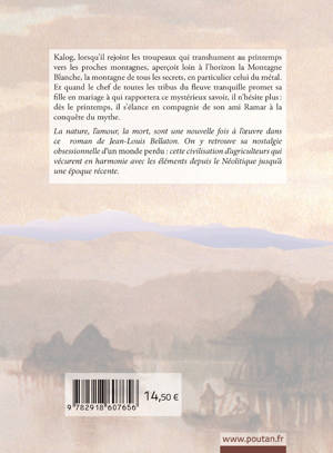 Kalog, lorsqu’il rejoint les troupeaux qui transhument au printemps vers les proches montagnes, aperçoit loin à l’horizon la Montagne Blanche, la montagne de tous les secrets, en particulier celui du métal. Et quand le chef de toutes les ribus du fleuve tranquille promet sa fille en mariage à qui rapportera ce mystérieux savoir, il n’hésite plus : dès le printemps, il s’élance en compagnie de son ami Ramar à la conquête du mythe. La nature, l’amour, la mort, sont une nouvelle fois à l’oeuvre dans ce roman de Jean-Louis Bellaton. On y retrouve cette nostalgie obsessionnelle d’un monde perdu : cette civilisation d’agriculteurs qui vécurent en harmonie avec les éléments depuis le Néolithique jusquà une époque récente.