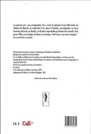 Le point de voir : une cartographie. On y croise la mémoire d'une 404 break, les toilettes du Meurice, la traduction d'un menu à Potsdam, une épitaphe, un vieux chameau désossé, un double, un Docteur improbable qui donne des conseils, trois jeunes filles sur la plage du Racou, la musique : bref tout ce qui nous compose. Et ce tout fait un roman.