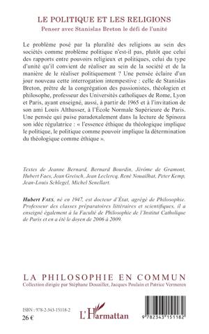 Le problème posé par la pluralité des religions au sein des sociétés comme problème politique n'est-il pas, plutôt que celui des rapports entre pouvoirs religieux et politiques, celui du type d'unité qu'il convient de réaliser au sein de la société et de la manière de le réaliser politiquement ? Une pensée éclaire d'un jour nouveau cette interrogation intempestive : celle de Stanislas Breton, prêtre de la congrégation des passionistes. Une pensée qui puise paradoxalement dans la lecture de Spinoza son idée régulatrice : « l'essence éthique du théologique implique le politique, le politique comme pouvoir implique la détermination du théologique comme éthique ».