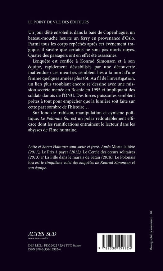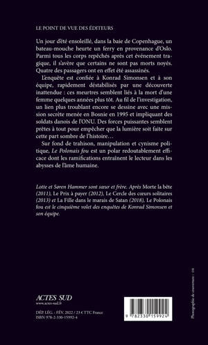 Un jour d'été ensoleillé, dans la baie de Copenhague, un bateau-mouche heurte un ferry en provenance d'Oslo. Parmi tous les corps repêchés après cet événement tragique, il s'avère que certains ne sont pas morts noyés. Quatre des passagers ont en effet été assassinés. L'enquête est confiée à Konrad Simonsen et à son équipe, rapidement déstabilisés par une découverte inattendue : ces meurtres semblent liés à la mort d'une femme quelques années plus tôt. Au fil de l'investigation, un lien plus troublant encore se dessine avec une mission secrète menée en Bosnie en 1995 et impliquant des soldats danois de l'ONU. Des forces puissantes semblent prêtes à tout pour empêcher que la lumière soit faite sur cette part sombre de l'histoire... Sur fond de trahison, manipulation et cynisme politique, "Le Polonais fou" est un polar redoutablement efficace dont les ramifications entraînent le lecteur dans les abysses de l'âme humaine.