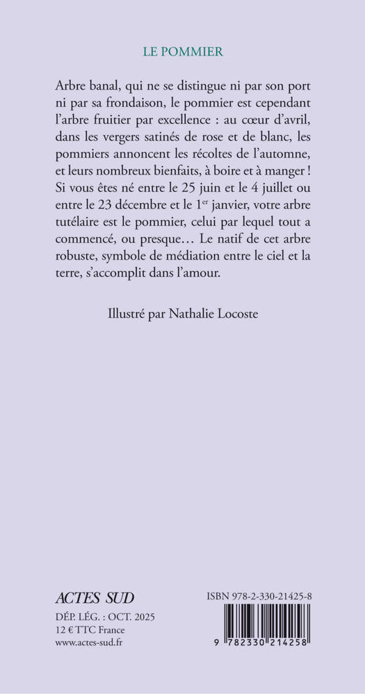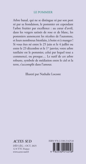 Une nouvelle édition avec rabats, sur papier de qualité, pour une collection emblématique « Le Nom de l'arbre » qui détaille l'anatomie et les besoins de chaque espèce et dévoile leur personnalité symbolique et leur place dans notre imaginaire. Arbre banal, qui ne se distingue ni par son port ni par sa frondaison, le pommier est cependant l'arbre fruitier par excellence. Celui par lequel tout a commencé, ou presque... Si vous êtes né entre le 25 juin et le 4 juillet ou entre le 23 décembre, et le Ier janvier, votre arbre tutélaire est le pommier, celui par lequel tout a commencé, ou presque... Le natif de cet arbre robuste, symbole de médiation entre le ciel et la terre, s'accomplit dans l'amour