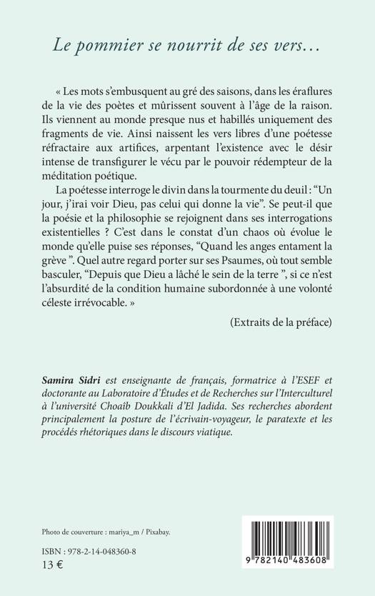 Les mots s'embusquent au gré des saisons, dans les éraflures de la vie des poètes et mûrissent souvent à l'âge de la raison. Ils viennent au monde presque nus et habillés uniquement des fragments de vie. Ainsi naissent les vers libres d'une poétesse réfractaire aux artifices, arpentant l'existence avec le désir intense de transfigurer le vécu par le pouvoir rédempteur de la méditation poétique. La poétesse interroge le divin dans la tourmente du deuil: "Un jour, j'irai voir Dieu, pas celui qui donne la vie". Se peut-il que la poésie et la philosophie se rejoignent dans ses interrogations existentielles ? C'est dans le constat d'un chaos où évolue le monde qu'elle puise ses réponses, "Quand les anges entament la grève". Quel autre regard porter sur ses Psaumes, où tout semble basculer, "Depuis que Dieu a lâché le sein de la terre", si ce n'est l'absurdité de la condition humaine subordonnée à une volonté céleste irrévocable. (Extraits de la préface)