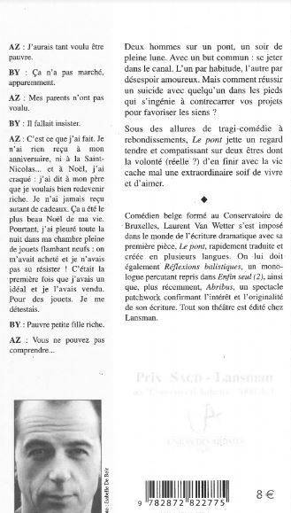 Deux hommes sur un pont, un soir de pleine lune. Avec un but commun : se jeter dans le canal. L'un par habitude, l'autre par désespoir amoureux. Mais comment réussir un suicide avec quelqu'un dans les pieds qui s'ingénie à contrecarrer vos projets pour favoriser les siens ? Sous des allures de tragi-comédie à rebondissements, Le pont jette un regard tendre et compatissant sur deux êtres dont la volonté (réelle ?) d'en finir avec la vie cache mal une extraordinaire soif de vivre et d'aimer.