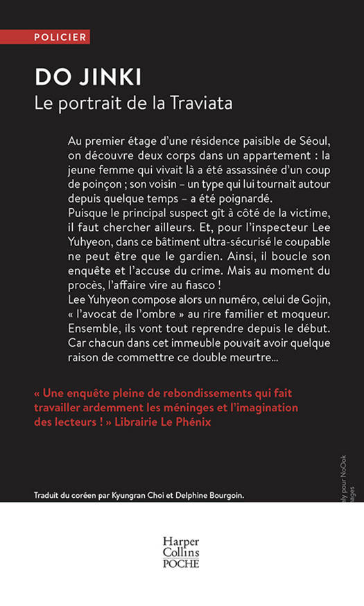 Au premier étage d’une résidence paisible de Séoul, on découvre deux corps dans un appartement : la jeune femme qui vivait là a été assassinée d’un coup de poinçon ; son voisin – un type qui lui tournait autour depuis quelque temps – a été poignardé. Puisque le principal suspect gît à côté de la victime, il faut chercher ailleurs. Et, pour l’inspecteur Lee Yuhyeon, dans ce bâtiment ultra-sécurisé le coupable ne peut être que le gardien. Ainsi, il boucle son enquête et l’accuse du crime. Mais au moment du procès, l’affaire vire au fiasco ! Lee Yuhyeon compose alors un numéro, celui de Gojin, « l’avocat de l’ombre » au rire familier et moqueur. Ensemble, ils vont tout reprendre depuis le début. Car chacun dans cet immeuble pouvait avoir quelque raison de commettre ce double meurtre… Traduit du coréen par Kyungran Choi et Delphine Bourgoin.