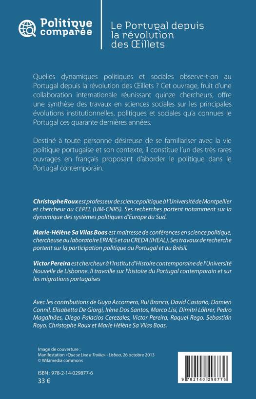 Quelles dynamiques politiques et sociales observe-t-on au Portugal depuis la révolution des OEillets ? Cet ouvrage, fruit d'une collaboration internationale réunissant quinze chercheurs, offre une synthèse des travaux en sciences sociales sur les principales évolutions institutionnelles, politiques et sociales qu'a connues le Portugal ces quarante dernières années. Destiné à toute personne désireuse de se familiariser avec la vie politique portugaise et son contexte, il constitue l'un des très rares ouvrages en français proposant d'aborder le politique dans le Portugal contemporain.