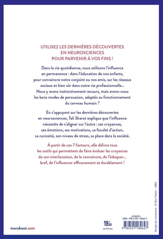 Dans la vie quotidienne, nous utilisons l’influence en permanence : dans l’éducation de nos enfants, pour convaincre notre conjoint ou nos amis, sur les réseaux sociaux et bien sûr dans notre vie professionnelle… Nous y avons instinctivement recours, mais avons-nous les bons modes de persuasion, adaptés au fonctionnement du cerveau humain ? En s’appuyant sur les dernières découvertes en neurosciences, Tali Sharot explique que l’influence nécessite de s’aligner sur l’autre : ses croyances, ses émotions, ses motivations, sa faculté d’action, sa curiosité, son niveau de stress, sa place dans la société. À partir de ces 7 facteurs, elle délivre tous les outils qui permettent de faire évoluer les croyances de son interlocuteur, de le convaincre, de l’éduquer… bref, de l’influencer efficacement et durablement !