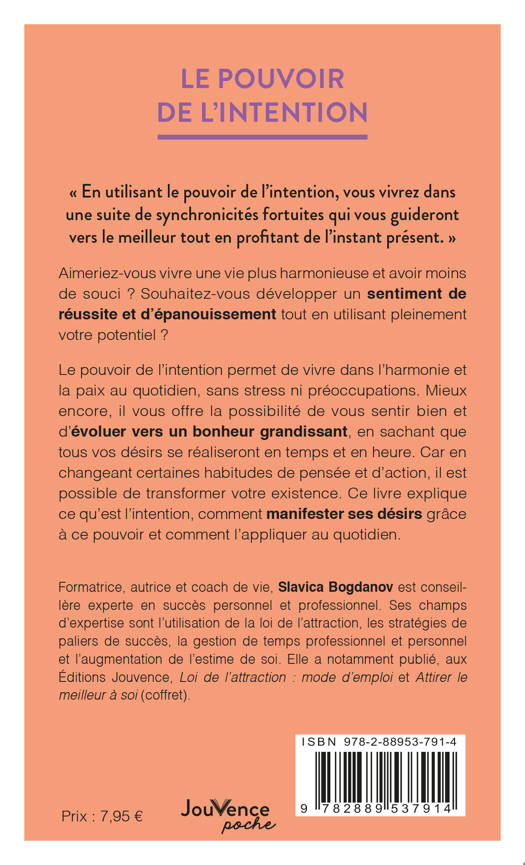 Le pouvoir de l’intention permet de vivre dans l’harmonie et la paix au quotidien, sans stress ni préoccupations. Mieux encore, il vous offre la possibilité de vous sentir bien et d’évoluer vers un bonheur grandissant, en sachant que tous vos désirs se réaliseront en temps et en heure. Car en changeant certaines habitudes de pensée et d’action, il est possible de transformer votre existence. Ce livre explique ce qu’est l’intention, comment manifester ses désirs grâce à ce pouvoir et comment l’appliquer au quotidien.