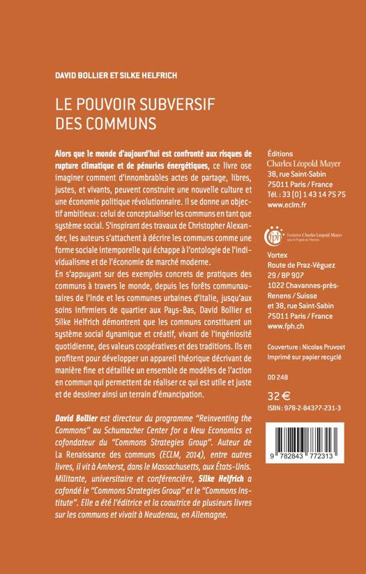 Alors que le monde d’aujourd’hui est confronté aux risques de rupture climatique et de pénuries énergétiques, ce livre ose imaginer comment d’innombrables actes de partage, libres, justes, et vivants, peuvent construire une nouvelle culture et une économie politique révolutionnaire. Il se donne un objectif ambitieux~: celui de conceptualiser les communs en tant que système social. S’inspirant des travaux de Christopher Alexander, les auteurs s’attachent à décrire les communs comme une forme sociale intemporelle qui échappe à l’ontologie de l’individualisme et de l’économie de marché moderne. En s’appuyant sur des exemples concrets de pratiques des communs à travers le monde, depuis les forêts communautaires de l’Inde et les communes urbaines d’Italie, jusqu’aux soins infirmiers de quartier aux Pays-Bas, David Bollier et Silke Helfrich démontrent que les communs constituent un système social dynamique et créatif, vivant de l’ingéniosité quotidienne, des valeurs coopératives et des traditions. Ils en profitent pour développer un appareil théorique décrivant de manière fine et détaillée un ensemble de modèles de l’action en commun qui permettent de réaliser ce qui est utile et juste et de dessiner ainsi un terrain d’émancipation.