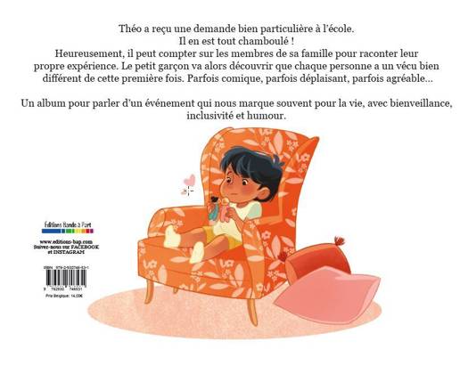 Théo a reçu une demande bien particulière à l’école. Il en est tout chamboulé !<br /> Heureusement, il peut compter sur les membres de sa famille pour raconter leur propre expérience.<br /> Le petit garçon va alors découvrir que chaque personne a un vécu bien différent de cette première fois. Parfois comique, parfois déplaisant, parfois agréable...<br /><br /> Un album pour parler d’un événement qui nous marque souvent pour la vie, avec bienveillance, inclusivité et humour.