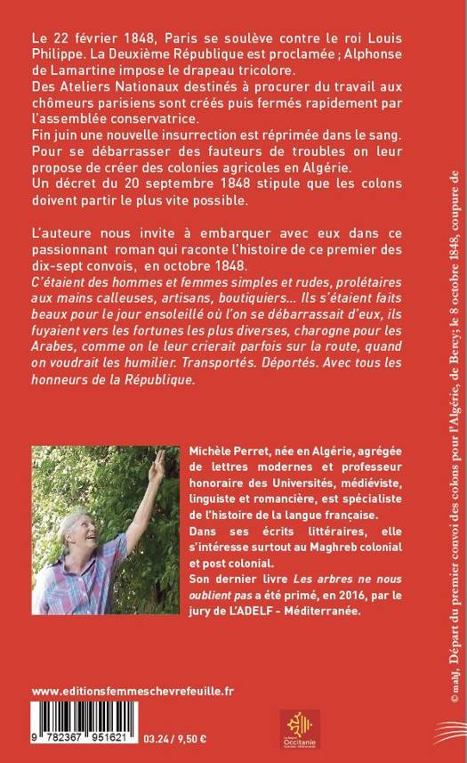 Le 22 février 1848, Paris se soulève contre le roi Louis Philippe. La Deuxième République est proclamée ; Alphonse de Lamartine impose le drapeau tricolore. Des Ateliers Nationaux destinés à procurer du travail aux chômeurs parisiens sont créés puis fermés rapidement par l’assemblée conservatrice. Fin juin une nouvelle insurrection est réprimée dans le sang. Pour se débarrasser des fauteurs de troubles on leur propose de créer des colonies agricoles en Algérie. Un décret du 20 septembre 1848 stipule que les colons doivent partir le plus vite possible. L’auteure nous invite à embarquer avec eux dans ce passionnant roman qui raconte l’histoire de ce premier des dix-sept convois, en octobre 1848. C’étaient des hommes et femmes simples et rudes, prolétaires aux mains calleuses, artisans, boutiquiers… Ils s’étaient faits beaux pour le jour ensoleillé où l’on se débarrassait d’eux, ils fuyaient vers les fortunes les plus diverses, charogne pour les Arabes, comme on le leur crierait parfois sur la route, quand on voudrait les humilier. Transportés. Déportés. Avec tous les honneurs de la République.
