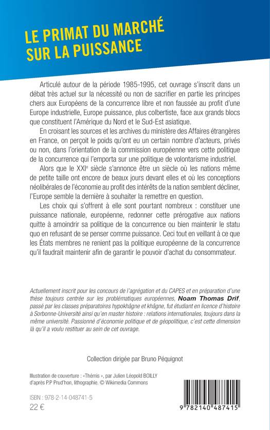 Articulé autour de la période 1985-1995, cet ouvrage s'inscrit dans un débat très actuel sur la nécessité ou non de sacrifier en partie les principes chers aux Européens de la concurrence libre et non faussée au profit d'une Europe industrielle, Europe puissance, plus colbertiste, face aux grands blocs que constituent l'Amérique du Nord et le Sud-Est asiatique. En croisant les sources et les archives du ministère des Affaires étrangères en France, on perçoit le poids qu'ont eu un certain nombre d'acteurs, privés ou non, dans l'orientation de la commission européenne vers cette politique de la concurrence qui l'emporta sur une politique de volontarisme industriel. Alors que le XXIe siècle s'annonce être un siècle où les nations même de petite taille ont encore de beaux jours devant elles et où les conceptions néolibérales de l'économie au profit des intérêts de la nation semblent décliner, l'Europe semble la dernière à souhaiter la remettre en question. Les choix qui s'offrent à elle sont pourtant nombreux: constituer une puissance nationale, européenne, redonner cette prérogative aux nations quitte à amoindrir sa politique de la concurrence ou bien maintenir le statu quo en refusant de se penser comme puissance. Ceci tout en veillant à ce que les États membres ne renient pas la politique européenne de la concurrence qu'il faudrait maintenir afin de garantir le pouvoir d'achat du consommateur.