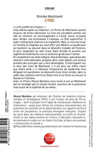 En complément du texte intégral, Pascal Boniface, spécialiste des relations internationales, propose dans cette édition une lecture actuelle des principes qui y sont développés. S'interrogeant sur le sens des mots de Machiavel, « Il est plus sûr d'être craint que d'être aimé », il réévalue l'importance du leadership d'un dirigeant et questionne la nécessité d'une force armée, dans le cadre des relations entre les États-Unis et la Chine ou encore la Russie et l'Ukraine.