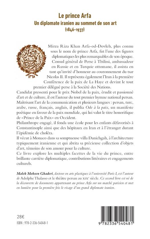Mirza Riza Khan Arfa-od-Dovleh, plus connu sous le nom de prince Arfa, fut l’une des figures diplomatiques les plus remarquables de son époque. Consul général de Perse à Tbilissi, ambassadeur en Russie et en Turquie ottomane, il assista en tant qu’invité d’honneur au couronnement du tsar Nicolas II. Il représenta également l’Iran à la première Conférence de la paix de La Haye et devint le tout premier délégué perse à la Société des Nations. Candidat pressenti pour le prix Nobel de la paix, érudit et passionné d’art et de culture, il est l’auteur du tout premier hymne national persan. Maîtrisant l’art de la communication et plusieurs langues : persan, turc, arabe, russe, français, anglais, il publia Ode à la paix, un manifeste poétique en faveur de la paix mondiale, qui lui valut le titre honorifique de « Prince de la Paix » en Occident. Philanthrope engagé, il fonda une école pour les enfants défavorisés à Constantinople ainsi que des hôpitaux en Iran et à l’étranger durant l’épidémie de choléra. Il vécut à Monaco dans sa somptueuse villa Danichgah, à l’architecture typiquement iranienne et qui abrita sa précieuse collection d’objets d’art, témoins de son amour pour la culture. Ce livre explore les multiples facettes de la vie du prince, entre brillante carrière diplomatique, contributions littéraires et engagements culturels.