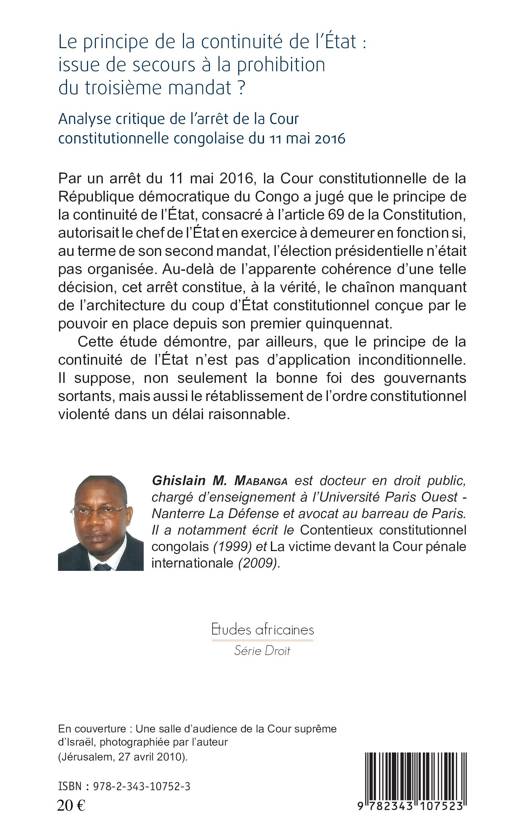 Par un arrêt du 11 mai 2016, la Cour constitutionnelle de la République démocratique du Congo a jugé que le principe de la continuité de l'État, consacré à l'article 69 de la Constitution, autorisait le chef de l'État en exercice à demeurer en fonction si, au terme de son second mandat, l'élection présidentielle n'était par organisée. Au-delà de l'apparente cohérence d'une telle décision, cet arrêt constitue le chaînon manquant de l'architecture du coup d'État constitutionnel conçu par le pouvoir en place depuis son premier équipement.