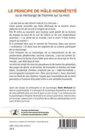 Je sais que je vais mourir mais je n'y crois pas. Cette parole recueillie par Alain Michaud de la bouche d'une patiente en fin de vie est à l'origine de ce livre. Elle fit écho au souvenir que l'auteur avait gardé de sa lecture du Voyage au bout de la nuit de Céline et de son énigmatique assertion La vérité de ce monde, c'est la mort. Il faut choisir, mourir ou mentir. Et il semblait bien que le monde de l'homme, dans son oeuvre civilisatrice et dans tous les registres de sa culture, participait de ce mensonge. C'est l'histoire de ce mensonge, de sa transmission et de ses productions (phallocratie, racisme, sciences...) qui est contée ici. D'abord sous la forme d'une fable puis dans un essai qui en tire la morale... par-delà bien et mal. Le récit est empli de tous les paradoxes et de toutes les péripéties des pages de gloire et de honte, de triomphe et d'échec du mâle blanc, occidental, chrétien emporté par sa mâle-honnêteté, son incapacité à accepter son Être-vers-la-mort . Avec, dormant tout au fond de son mystère, l'espoir que l'assomption de sa mort permette à l'homme d'accéder enfin à une véritable humanité.