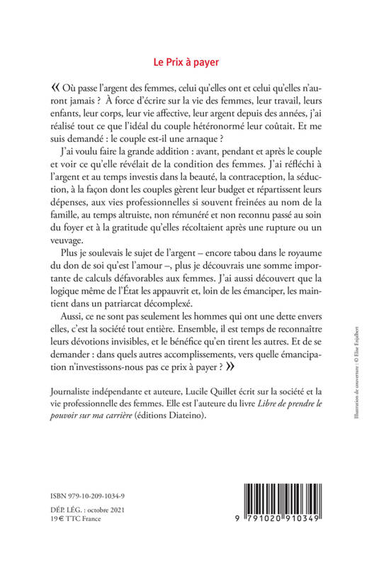 « Cela fait des années que je me penche sur la vie des femmes : leur travail, leurs enfants, leur vie affective, leur argent. Aujourd'hui j'ai voulu faire les comptes et regar¬der à la loupe ce que leurs dépenses nous révélaient de leur condition et au-delà de ça, ce que cette question disait de notre société. Plus je soulevais le sujet considéré comme tabou et mesquin de l'argent dans le royaume du don de soi qu'est l'amour, plus je découvrais une somme importante de calculs défavorables aux femmes. L'obsession du couple dans les sociétés occidentales contraint les femmes à réaliser des efforts et des sacrifices considérables - et onéreux -, avant même d'être en couple. Plus tard, les charges domestiques et familiales aspirent leur temps, leur coûtent des opp ortunités en termes de carrière et de salaire : pendant que les femmes travaillent gratuitement pour le foyer, leurs conjoints s'investissent dans leur travail, acquièrent des biens durables et capitalisent sur le long terme en leur seul nom. J'ai également constaté que la logique même de l'État appauvrit les femmes et, loin de les émanciper, les maintient dans un patriarcat décomplexé. Aussi ce ne sont pas seulement les hommes qui doivent reconnaître leur dette envers elles, c'est la société tout entière qui doit interroger dans quelles autres sphères, dans quels autres accomplissements personnels, elles n'investissent pas ce prix à payer, freinant leur émancipation. » Lucile Quillet