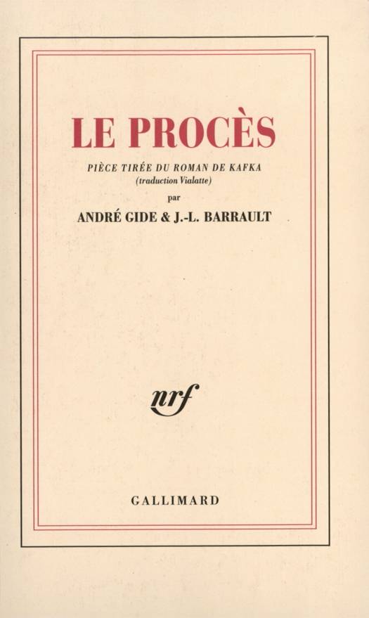 "Sans Jean-Louis Barrault n'existerait pas cette pièce inspirée par le célèbre roman de Kafka. J'ai noté dans mon Journal notre rencontre à Marseille. C'était le 4 mai 1942. Je devais m'embarquer le lendemain pour Tunis où je fus retenu tout le temps de la pénible occupation allemande. Jean-Louis Barrault me parla ce jour-là de son projet de porter à la scène Le Procès de Kafka et me demanda si j'acceptais de l'y aider. J'avais pour ce livre étrange une admiration des plus vives mais lui dis qu'avant de me décider j'avais besoin de la relire. Ce que je fis. Et je dois avouer que d'abord les difficultés que présentait une telle adaptation me parurent insurmontables. Mais c'était faire injure au génie de Jean-Louis Barrault. À mon retour en France en 45, il revint à la charge. Il avait travaillé de son côté, préparé une sorte de scénario déjà détaillé, qu'il me soumit. Il ne s'agissait plus que de couvrir de chair le squelette qu'il m'apportait. Je fus tout aussitôt requis, et me mis au travail avec joie, avec zèle, avec enthousiasme. Je n'eus du reste, le plus souvent, qu'à me servir du texte de l'excellente traduction de Vialatte. Rarement je mis plus de "coeur à l'ouvrage", tout en m'effaçant le plus possible pour céder la place à Kafka, dont je tenais à respecter toutes les intentions." André Gide.