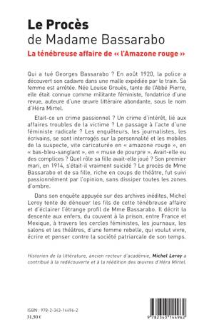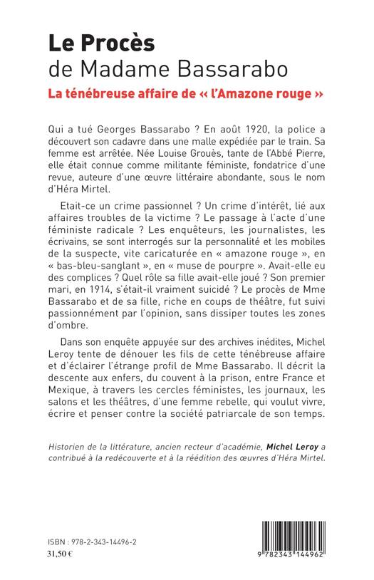 Qui a tué Georges Bassarabo ? En août 1920, la police a découvert son cadavre dans une malle expédiée par le train. Sa femme est arrêtée. Née Louise Grouès, tante de l'Abbé Pierre, elle était connue comme militante féministe, auteure d'une oeuvre littéraire abondante, sous le nom d'Héra Mirtel. Etait-ce un crime passionnel ? Un crime d'intérêt, lié aux affaires troubles de la victime ? Le passage à l'acte d'une féministe radicale ? Dans son enquête appuyée sur des archives inédites, Michel Leroy tente de dénouer les fils de cette ténébreuse affaire.