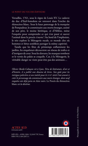 Versailles, 1761, sous le règne de Louis XV. Le cadavre du duc d'Etel-Semolens est retrouvé dans l'enclos du rhinocéros blanc. Sous le haut patronage de la marquise de Pompadour, le commissaire aux morts étranges, assisté de son père, le moine hérétique, et d'Hélène, mène l'enquête pour comprendre ce qui s'est passé et sauver l'animal dont le procès s'ouvre ! Au bord de l'implosion, le trio explore la Ménagerie royale, ce monde clos où hommes et bêtes semblent partager la même captivité. Tandis que les fêtes de printemps enflamment les jardins, les enquêteurs découvrent un réseau de trafics et d'intrigues de cour. Sous les dorures, les masques tombent et le vernis du palais se craquèle. Car, à la Ménagerie, le véritable danger ne vient peut-être pas des animaux...