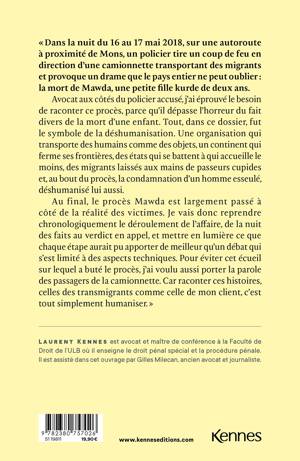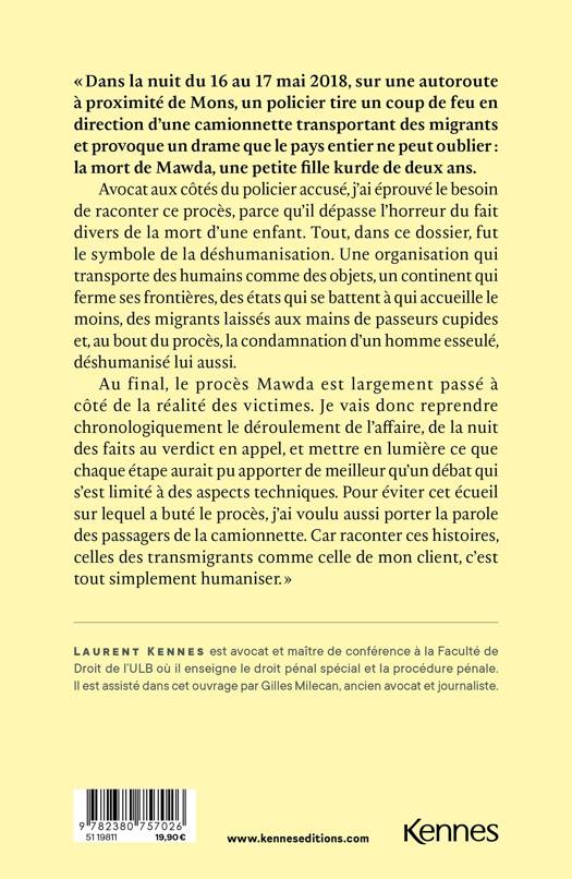 « Ce qui choque, ce n'est pas qu'un policier n'aurait pas dû sortir son arme, mais que 27 êtres humains n'ont pas à se retrouver entassés dans cette maudite camionnette blanche. » Dans la nuit du mercredi 16 au jeudi 17 mai 2018, sur une autoroute belge à proximité de Mons, un policier tirait un coup de feu en direction d'une camionnette transportant des migrants et provoque un drame que le pays entier peine à oublier : la mort de Mawda, une petite fille kurde de deux ans. S'en est suivi une minutieuse enquête qui a débouché en décembre 2020 sur un procès très médiatisé, un procès pas comme les autres pour l'avocat de la défense Laurent Kennes qui a décidé, à travers cet ouvrage, de raconter en détail sa version de « l'affaire Mawda » et démontrer que l'histoire de ce drame, c'est avant tout celle de la migration.