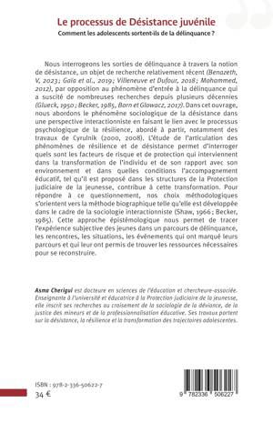 Nous interrogeons les sorties de délinquance à travers la notion de désistance, un objet de recherche relativement récent (Benazeth, V, 2023; Gaïa et al., 2019; Villeneuve et Dufour, 2018; Mohammed, 2012), par opposition au phénomène d'entrée à la délinquance qui a suscité de nombreuses recherches depuis plusieurs décennies (Glueck, 1950; Becker, 1985, Born et Glowacz, 2017). Dans cet ouvrage, nous abordons le phénomène sociologique de la désistance dans une perspective interactionniste en faisant le lien avec le processus psychologique de la résilience, abordé à partir, notamment des travaux de Cyrulnik (2000, 2008). L'étude de l'articulation des phénomènes de résilience et de désistance permet d'interroger quels sont les facteurs de risque et de protection qui interviennent dans la transformation de l'individu et de son rapport avec son environnement et dans quelles conditions l'accompagnement éducatif, tel qu'il est proposé dans les structures de la Protection judiciaire de la jeunesse, contribue à cette transformation. Pour répondre à ce questionnement, nos choix méthodologiques s'orientent vers la méthode biographique telle qu'elle est développée dans le cadre de la sociologie interactionniste (Shaw, 1966; Becker, 1985). Cette approche épistémologique nous permet de tracer l'expérience subjective des jeunes dans un parcours de délinquance, les rencontres, les situations, les événements qui ont marqué leurs parcours et qui leur ont permis de trouver les ressources nécessaires pour se reconstruire.