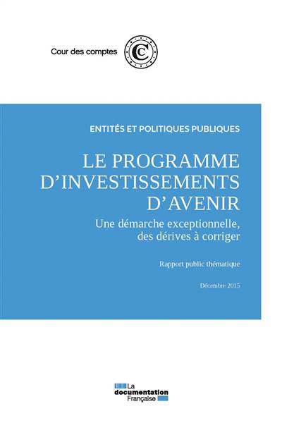La Cour a étudié le programme d'investissements d'avenir (PIA). Lancé en 2010, ce programme, d'un montant total de 35 Md'euros, a été voulu à l'origine comme un programme exceptionnel, destiné principalement à des investissements dans le domaine de la recherche et de l'innovation. Il a fait l'objet de dispositions particulières pour permettre de gérer dans la durée, de manière extrabudgétaire, à travers des opérateurs de l'État, le montant de ses crédits.