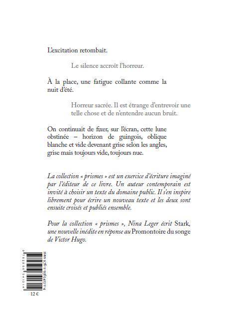Le promontoire du songe est un court texte écrit par Victor Hugo en 1863. Lorsqu'il rend visite à son ami Arago à l'Observatoire, ce dernier lui fait regarder la lune au telescope. D'un coup Hugo s'emballe, et nous livre une longue rêverie à mi-chemin entre l'essai poétique et la poésie en prose. Stark est une nouvelle écrite par Nina Leger en 2018, en réponse au Promontoire du songe. Il s'inscrit entre le témoignage et la biographie, et raconte comment fut perçu le premier pas sur la lune de Neil Armstrong en 1969.
