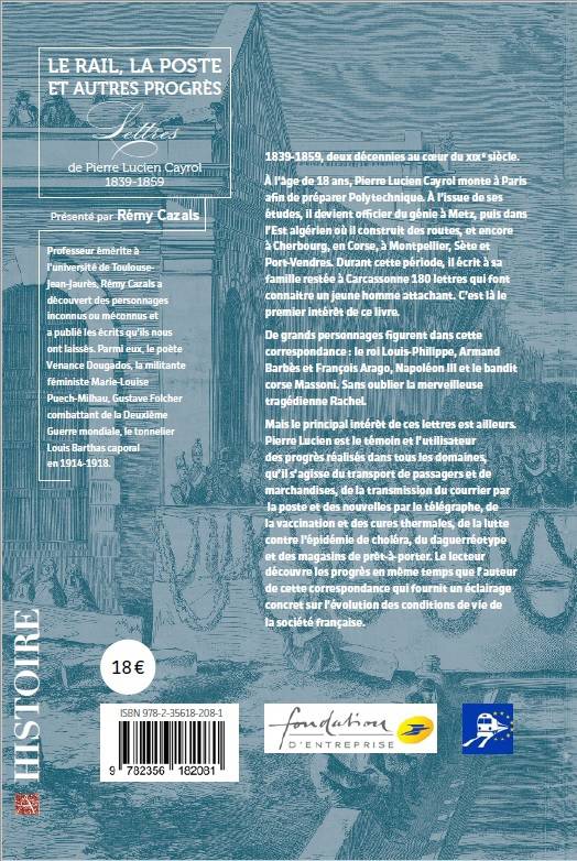 1839-1859, deux décennies au coeur du XIXe siècle [...] Pierre Lucien est le témoin et l'utilisateur des progrès réalisés dans tous les domaines, qu'il s'agisse du transport de passagers et de marchandises, de la transmission du courrier par la poste et des nouvelles par le télégraphe, de la vaccination et des cures thermales, de la lutte contre l'épidémie de choléra, du daguerréotype et des magasins de prêt-à-porter. Le lecteur découvre les progrès en même temps que l'auteur de cette correspondance qui fournit un éclairage concret sur l'évolution des conditions de vie de la société française.