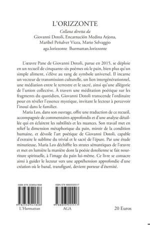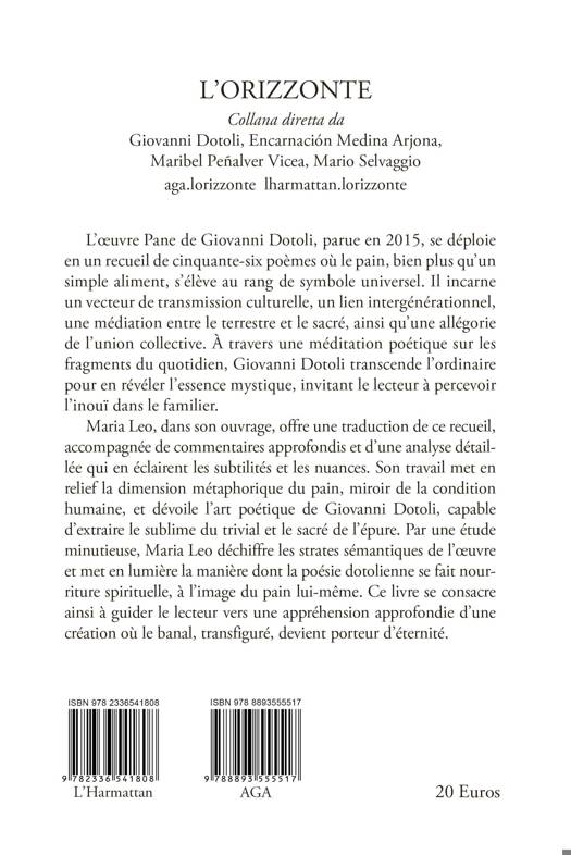 Cet ouvrage propose une traduction intégrale et commentée des poèmes du recueil Pane de Giovanni Dotoli, accompagnée d’une analyse visant à en éclairer les enjeux et les subtilités. Mon ambition est de dépasser une lecture strictement littérale et une compréhension immédiate pour offrir des clés permettant d’appréhender la richesse et la complexité du langage poétique de l’auteur. En effet, son écriture poétique, empreinte de mystère et d’une certaine opacité, requiert une lecture attentive et approfondie, où chaque mot choisi avec une précision quasi alchimique, confère aux vers une dimension à la fois intime et universelle. C’est précisément cette singularité du langage poétique, ainsi que la richesse thématique de l’œuvre, qui m’ont incitée à traduire cet ouvrage en français. Par cette traduction, son commentaire et son analyse, j’aspire à accompagner le lecteur dans une immersion réfléchie et éclairée, en lui proposant des interprétations qui enrichissent sa compréhension. Mon objectif est de lui ouvrir les portes de l’univers poétique de Giovanni Dotoli, en révélant la puissance évocatrice et la profondeur de son écriture, afin qu’il en perçoive toute la portée symbolique et la résonance émotionnelle. L’œuvre Pane de Giovanni Dotoli, parue en 2015, se déploie en un recueil de cinquante-cinq poèmes où le pain, bien plus qu’un simple aliment, s’élève au rang de symbole universel. Il incarne un vecteur de transmission culturelle, un lien intergénérationnel, une médiation entre le terrestre et le sacré, ainsi qu’une allégorie de l’union collective. À travers une méditation poétique sur les fragments du quotidien, Giovanni Dotoli transcende. l’ordinaire pour en révéler l’essence mystique, invitant le lecteur à percevoir l’inouï dans le familier. Maria Leo, dans son ouvrage, offre une traduction de ce recueil, accompagnée de commentaires approfondis et d’une analyse détaillée qui en éclairent les subtilités et les nuances. Son travail met en relief la dimension métaphorique du pain, miroir de la condition humaine, et dévoile l’art poétique de Giovanni Dotoli, capable d’extraire le sublime du trivial et le sacré de l’épure. Par une étude minutieuse, Maria Leo déchiffre les strates sémantiques de l’œuvre et met en lumière la manière dont la poésie dotolienne se fait nourriture spirituelle, à l’image du pain lui-même. Ce livre se consacre ainsi à guider le lecteur vers une appréhension approfondie d’une création où le banal, transfiguré, devient porteur d’éternité.