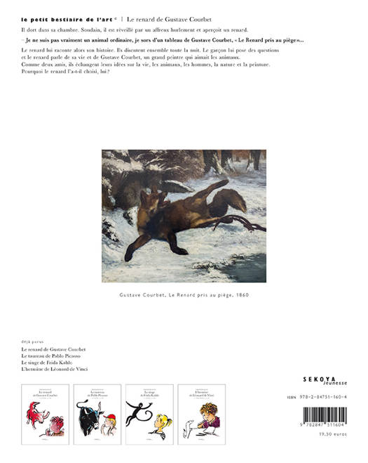 "Il dort dans sa chambre. Soudain, il est réveillé par un affreux hurlement et aperçoit un renard. ""Je ne suis pas vraiment un animal ordinaire, je sors d'un tableau de Gustave Courbet, Le Renard pris au piège."" Le renard lui raconte alors son histoire. Ils discutent ensemble toute la nuit. Le garçon lui pose des questions et le renard parle de sa vie et de Gustave Courbet, un grand peintre qui aimait les animaux. Comme deux amis, ils échangent leurs idées sur la vie, les animaux, les hommes, la nature et la peinture."