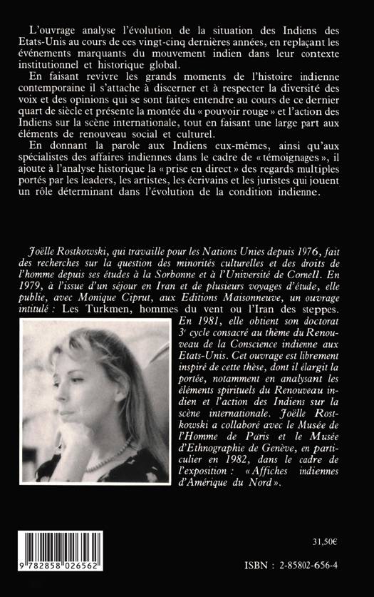L'ouvrage analyse l'évolution de la situation des Indiens des Etats-Unis au cours de ces vingt dernières années, en replaçant les évènements marquant dans leur contexte institutionnel et historique global. Il s'attache à discerner et respecter la diverité des voix qui se sont faites entendre et présente la montée du ""pouvoir rouge"", l'action des Indiens sur la scène internationale, tout en abordant le renouveau social et culturel. La parole est donnée aux Indiens eux-mêmes et spécialistes des questions indiennes.