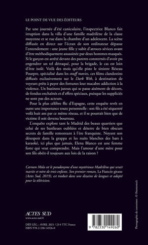 Par une journée d'été caniculaire, l'inspectrice Blanco fait irruption dans la villa d'une famille madrilène de la classe moyenne et se rue dans la chambre d'un adolescent. La scène diffusée en direct sur l'écran de son ordinateur dépasse l'entendement : une jeune fille y subit d'atroces sévices avant d'être méthodiquement assassinée par deux hommes masqués. Si le garçon est arrêté devant des parents consternés d'avoir pu engendrer un tel détraqué, pour la brigade, le cas est loin d'être isolé. Voilà des mois qu'elle piste le sinistre Réseau Pourpre, spécialisé dans les «snuff movies», ces films clandestins diffusés exclusivement sur le «Dark Web», à destination de voyeurs prêts à payer des fortunes leur macabre addiction à la violence. Un business juteux qui se passe aisément de décors, de fondus enchaînés et d'effets spéciaux, puisque les suppliciés ne sont pas des acteurs.