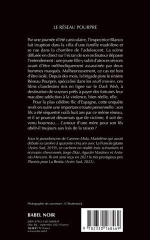 Par une journée d'été caniculaire, l'inspectrice Blanco fait irruption dans la villa d'une famille madrilène et se rue dans la chambre de l'adolescent. La scène diffusée en direct sur l'écran de son ordinateur dépasse l'entendement : une jeune fille y subit d'atroces sévices avant d'être méthodiquement assassinée par deux hommes masqués. Malheureusement, ce cas est loin d'être isolé. Depuis des mois, la brigade piste le sinistre Réseau Pourpre, spécialisé dans les "snuff movies", ces films clandestins mis en ligne sur le Dark Web, à destination de voyeurs prêts à payer des fortunes leur macabre addiction à la violence, bien réelle, elle. Pour la plus célèbre flic d'Espagne, cette enquête revêt en outre une importance toute personnelle : son fils a été séquestré voilà huit ans par ce même réseau, et il se pourrait désormais que de victime, il soit devenu bourreau... L'amour d'une mère pour son fils obéit-il toujours aux lois de la raison ?