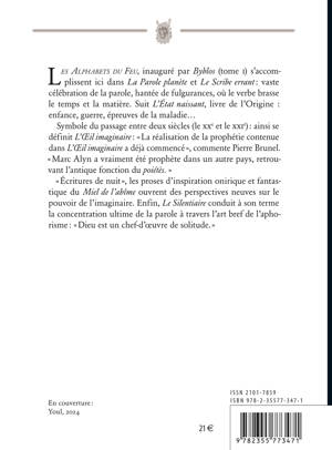 LE CONTENU. Sous le titre Le Rêveur éveillé (1992 – 2004), le Tome 2 des Œuvres Poétiques de Marc Alyn contient la réédition intégrale des ouvrages suivants :– Les Alphabets du Feu, II, La Parole planète, Le Castor astral, 1992 ;– Les Alphabets du Feu, III, Le Scribe errant, Le Castor astral, 1993 ;– L’État naissant, Phi , 1996 ;– L’OEil imaginaire, Phi , 1998 ;– Le Miel de l’abîme, Cinq Continents, 1999 ;– Le Silentiaire, Dumerchez, 2004.Le Tome 2 est introduit par un texte de Georges-Emmanuel Clancier Le poète des gisements de rêves
