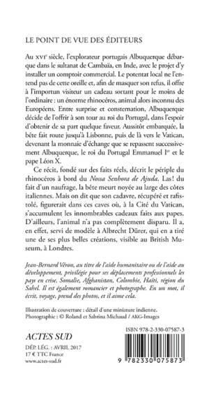 Ce récit, fondé sur des faits réels, décrit le périple du rhinocéros à bord du «Nossa Senhora de Ajuda». Las ! du fait d'un naufrage, la bête meurt noyée au large des côtes italiennes. Mais on dit que son cadavre, récupéré et rafistolé, figurerait dans ces caves où, à la Cité du Vatican, s'accumulent les innombrables cadeaux faits aux papes. D'ailleurs, l'animal n'a pas complètement disparu. Il a, en effet, servi de modèle à Albrecht Dürer, qui en a tiré une de ses plus belles créations, visible au British Museum, à Londres.