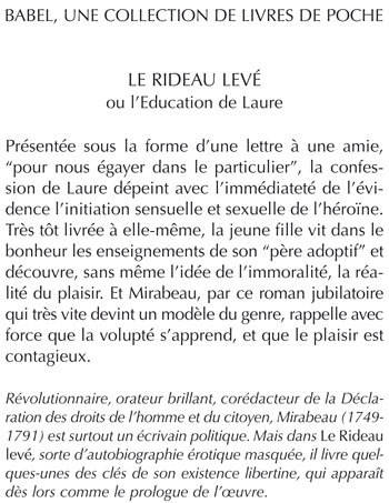 Révolutionnaire, orateur brillant, corédacteur de la Déclaration des droits de l'homme et du citoyen, Mirabeau (1749- 1791) est surtout un écrivain politique. Mais dans Le Rideau levé, sorte d'autobiographie érotique masquée, il livre quelques- unes des clés de son existence libertine, qui apparaît dès lors comme le prologue de l'oeuvre.