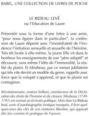Présentée sous la forme d'une lettre à une amie, "pour nous égayer dans le particulier", la confession de Laure dépeint avec l'immédiateté de l'évidence l'initiation sensuelle et sexuelle de l'héroïne. Très tôt livrée à elle-même, la jeune fille vit dans le bonheur les enseignements de son "père adoptif" et découvre, sans même l'idée de l'immoralité, la réalité du plaisir. Et Mirabeau, par ce roman jubilatoire qui très vite devint un modèle du genre, rappelle avec force que la volupté s'apprend, et que le plaisir est contagieux.