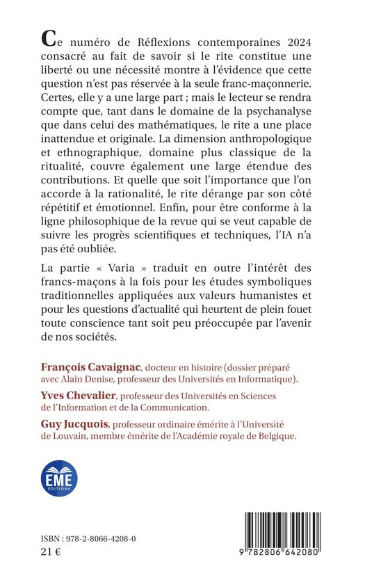 Ce numéro de Réflexions contemporaines 2024 consacré au fait de savoir si le rite constitue une liberté ou une nécessité montre à l’évidence que cette question n’est pas réservée à la seule franc-maçonnerie. Certes, elle y a une large part  ; mais le lecteur se rendra compte que, tant dans le domaine de la psychanalyse que dans celui des mathématiques, le rite a une place inattendue et originale. La dimension anthropologique et ethnographique, domaine plus classique de la ritualité, couvre également une large étendue des contributions. Et quelle que soit l’importance que l’on accorde à la rationalité, le rite dérange par son côté répétitif et émotionnel. Enfin, pour être conforme à la ligne philosophique de la revue qui se veut capable de suivre les progrès scientifiques et techniques, l’IA n’a pas été oubliée.