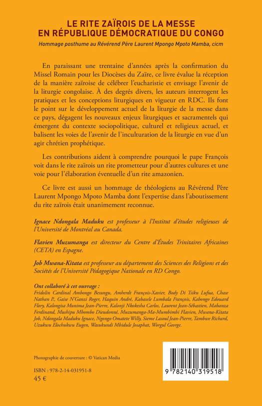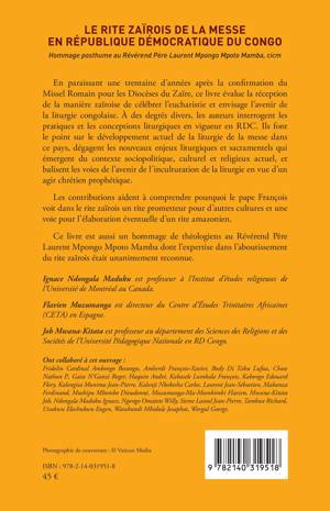 En paraissant une trentaine d'années après la confirmation du Missel Romain pour les Diocèses du Zaïre, ce livre évalue la réception de la manière zaïroise de célébrer l'eucharistie et envisage l'avenir de la liturgie congolaise. À des degrés divers, les auteurs interrogent les pratiques et les conceptions liturgiques en vigueur en RDC. Ils font le point sur le développement actuel de la liturgie de la messe dans ce pays, dégagent les nouveaux enjeux liturgiques et sacramentels qui émergent du contexte sociopolitique, culturel et religieux actuel, et balisent les voies de l'avenir de l'inculturation de la liturgie en vue d'un agir chrétien prophétique.