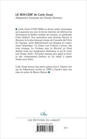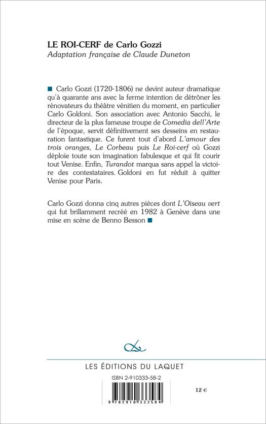 Adaptation française Claude Duneton Carlo Gozzi (1720-1806) ne devint auteur dramatique qu’à quarante ans avec la ferme intention de détrôner les rénovateurs du théâtre vénitien du moment, en particulier Carlo Goldoni. Son association avec Antonio Sacchi, le directeur de la plus fameuse troupe de Comedia dell’Arte de l’époque, servit définitivement ses desseins en restauration fantastique. Ce furent tout d’abord L’amour des trois oranges, Le Corbeau puis Le Roi-cerf où Gozzi déploie toute son imagination fabulesque et qui fit courir tout Venise. Enfin, Turandot marqua sans appel la victoire des contestataires. Goldoni en fut réduit à quitter Venise pour Paris. Carlo Gozzi donna cinq autres pièces dont L’Oiseau vert qui fut brillamment recréé en 1982 à Genève dans une mise en scène de Benno Besson