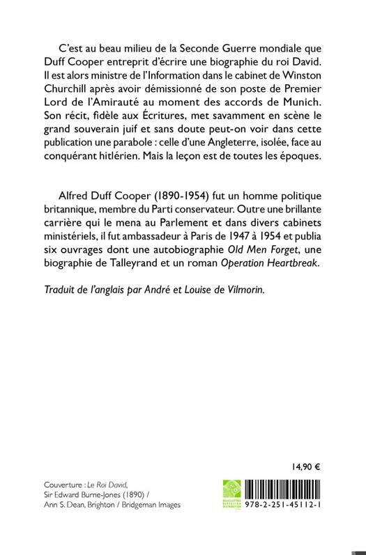 C'est au beau milieu de la Seconde Guerre mondiale que Duff Cooper entreprit d'ecrire une biographie du roi David. Il est alors ministre de l'Information dans le cabinet de Winston Churchill apres avoir demissionne de son poste de Premier Lord de l'Amiraute au moment des accords de Munich. Son recit, fidele aux Ecritures, met savamment en scene le grand souverain juif et sans doute peut-on voir dans cette publication une parabole: celle d'une Angleterre, isolee, face au conquerant hitlerien. Mais la lecon est de toutes les epoques.