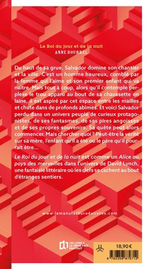 Du haut de sa grue, Salvador domine son chantier et la ville. C’est un homme heureux, comblé par la femme qui l’aime et son premier enfant qui va naître. Mais tout à coup, alors qu’il contemple per-plexe le trou apparu au bout de sa chaussette en laine, il est aspiré par cet espace entre les mailles et chute dans de profonds abîmes. Et voici Salvador perdu dans un univers peuplé de curieux protago-nistes, de ses fantasmes, de ses pires angoisses et de ses propres souvenirs. Sa quête peut alors commencer. Mais chercher quoi ? Peut-être la vérité sur sa mère, l’enfant qu’il a été ou le père qu’il pour-rait être... Le Roi du jour et de la nuit est comme un Alice au pays des merveilles dans l’univers de David Lynch, une fantaisie littéraire où les clefs se cachent au bout d’étranges sentiers.