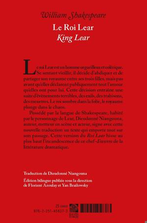 Possédé par la langue de Shakespeare, habité par le personnage de Lear, Dieudonné Niangouna, auteur, metteur en scène et acteur, signe avec cette nouvelle traduction un texte qui emporte tout sur son passage. Cette version du Roi Lear hisse au plus haut l'incandescence de ce chef-d’oeuvre de la littérature dramatique.