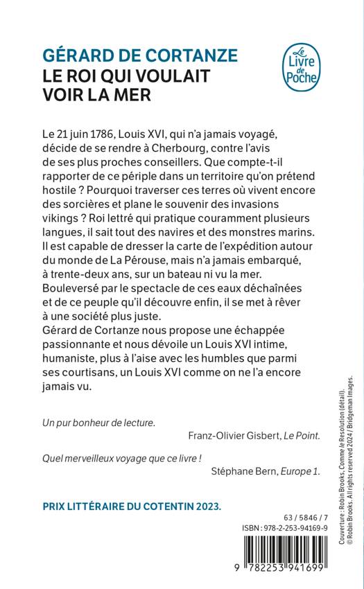 Le 21 juin 1786, Louis XVI, qui n’a jamais voyagé, décide de se rendre à Cherbourg, contre l’avis de ses plus proches conseillers. Que compte-t-il rapporter de ce périple dans un territoire qu’on prétend hostile ? Pourquoi traverser ces terres où vivent encore des sorcières et plane le souvenir des invasions vikings ? Roi lettré qui pratique couramment plusieurs langues, il sait tout des navires et des monstres marins. Il est capable de dresser la carte de l’expédition autour du monde de La Pérouse, mais n’a jamais embarqué, à trente-deux ans, sur un bateau ni vu la mer. Bouleversé par le spectacle de ces eaux déchaînées et de ce peuple qu’il découvre enfin, il se met à rêver à une société plus juste.