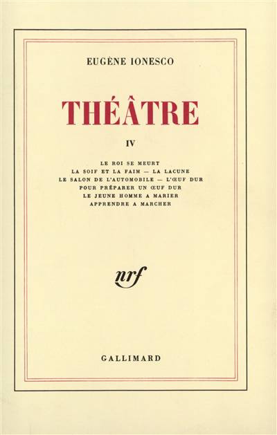 La Soif et la Faim, Le Roi se meurt, L'Œuf dur, La Lacune, Le Salon de l'automobile sont les titres des pièces qui composent ce quatrième tome de théâtre. La Soif et la Faim est l'histoire d'un homme qui souffre d'une maladie très répandue : celle de ne pouvoir tenir en place, de ne pouvoir trouver en lui-même la joie ou la sérénité. Il court les routes, il s'égare dans une quête sans espoir. Le Roi se meurt est la cérémonie de l'agonie d'un roi burlesque et tout-puissant : il avait commandé aux éléments, avait régné pendant des siècles, ne peut accepter l'effondrement de son univers (de son royaume) ni sa propre mort. La reine lui apprend à mourir. Les autres pièces sont des scènes courtes, humoristiques, comiques.
