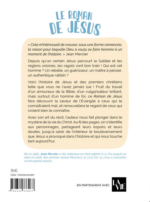 Voici l’histoire de Jésus et des premiers chrétiens telle que vous ne l’avez jamais lue ! Fruit du travail d’un amoureux de la Bible, d’un vulgarisateur brillant, mais surtout d’un homme de foi, ce Roman de Jésus fera découvrir la saveur de l’Évangile à ceux qui le connaîtraient mal, et renouvellera le regard de ceux qui croient bien le connaître. Avec son art du récit et une grande finesse psychologique, l’auteur nous fait plonger dans le mystère de la vie du Christ. Au fil des pages, on s’identifie aux personnages, partageant leurs espoirs et leurs doutes, jusqu’à saisir de l’intérieur le bouleversement que Jésus a provoqué dans l’histoire et qui nous touche tant aujourd’hui. « Cela m’intéressait de creuser, sous une forme romancée, la raison pour laquelle Dieu a voulu se faire homme à un moment de l’histoire. » Jean Mercier